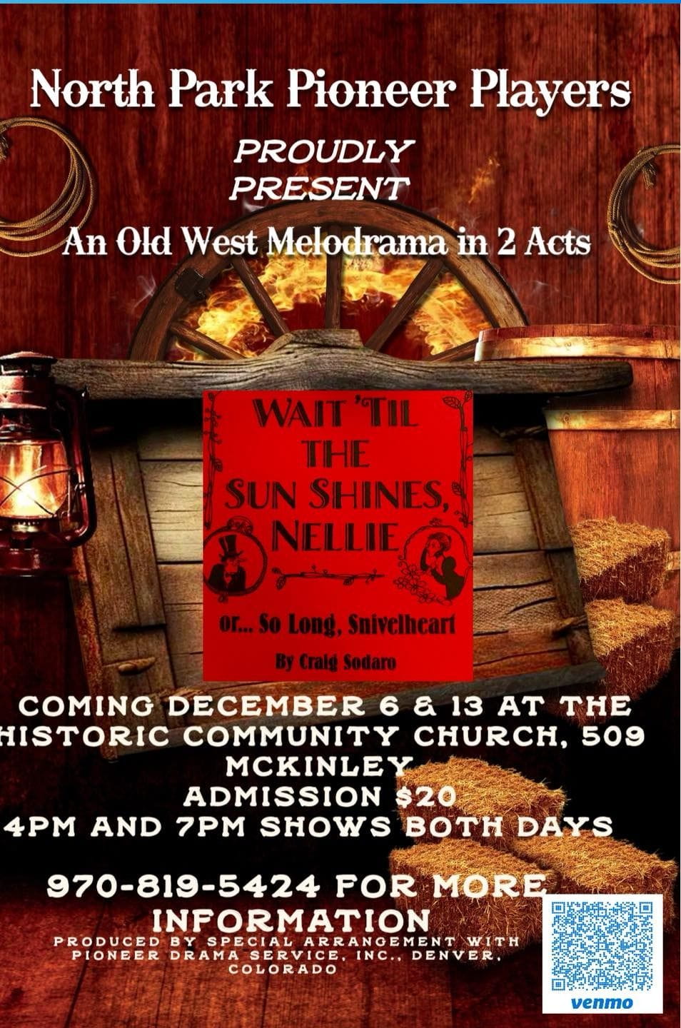 North Park Pioneer Players Presents: “‘Wait Til the Sun Shines, Nellie’ or ‘So Long, Snivelheart!!’ An Old West Melodrama” at the Community Church in Walden, CO on December 6th. Showtimes will be at 4pm and 7pm. Tickets are $20. Call 970-819-5424 for more information.